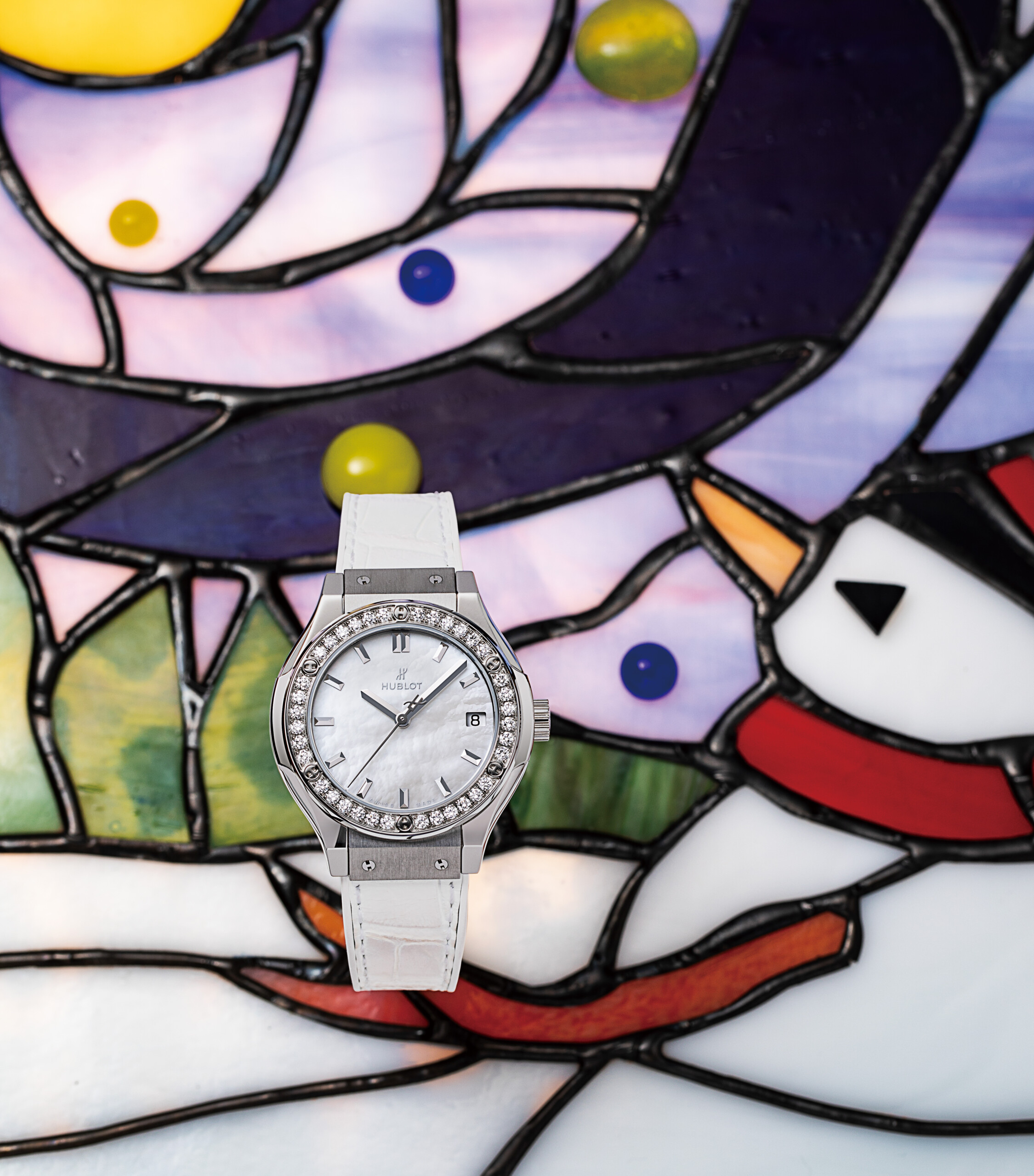 ドレッシーな印象を与えるマザー・オブ・パールやダイヤモンドと、軽量で丈夫なチタンとのミックス&マッチは、まさしくウブロの「アート・オブ・フュージョン」を体現する。これから迎える年末のホリデーシーズンにはパーティーなどでのドレスアップシーンや、ゆったりと寛げるリゾートで過ごすこともあるだろう。そんな時、腕元を華やかに彩り、アクティブに使い込めるのが、この時計の大きな魅力なのである。
