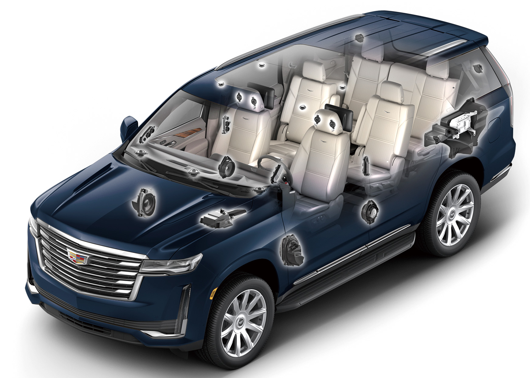 エスカレードのSportとPlatinumuには36個、Premiumには19個のスピーカーが装着される。