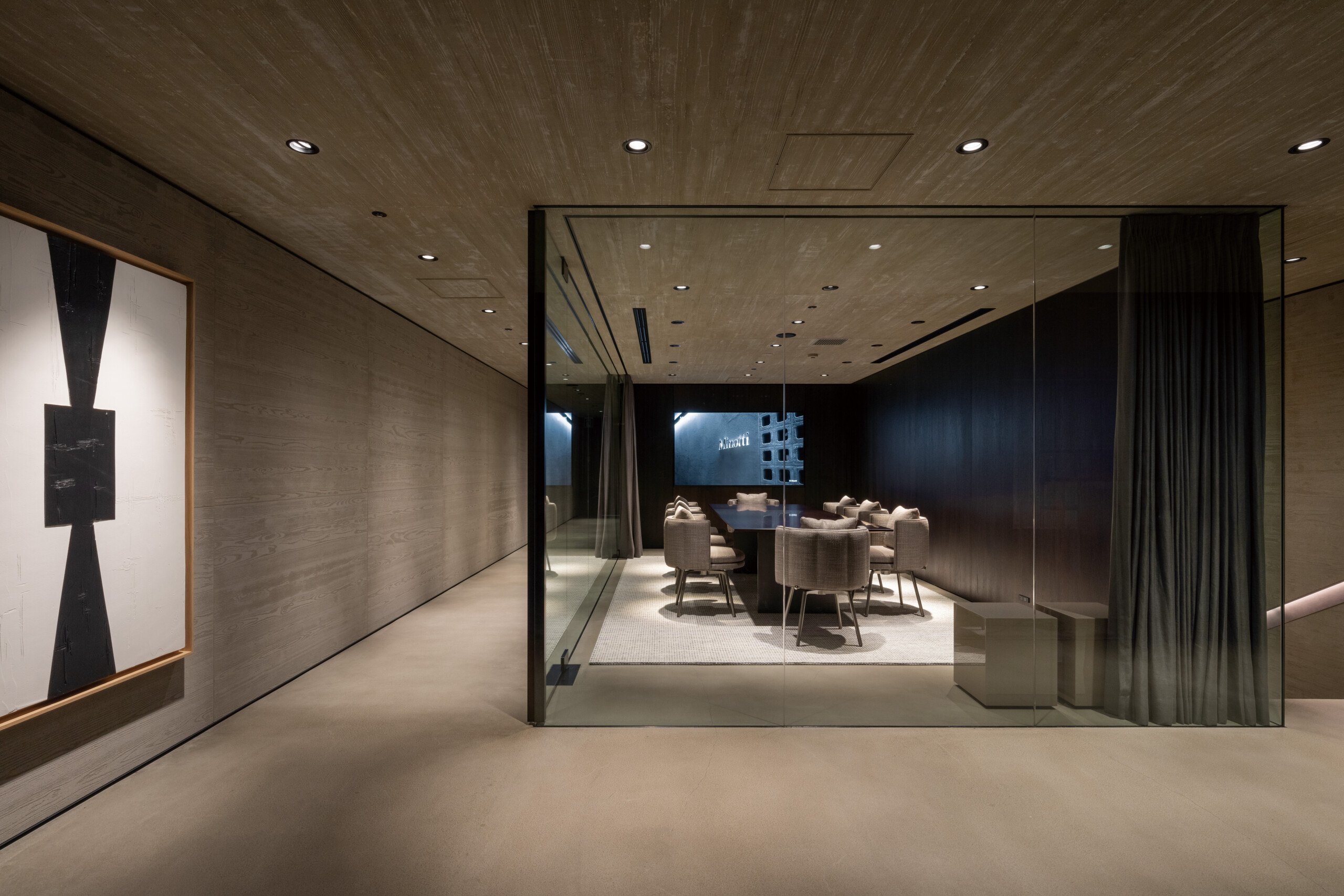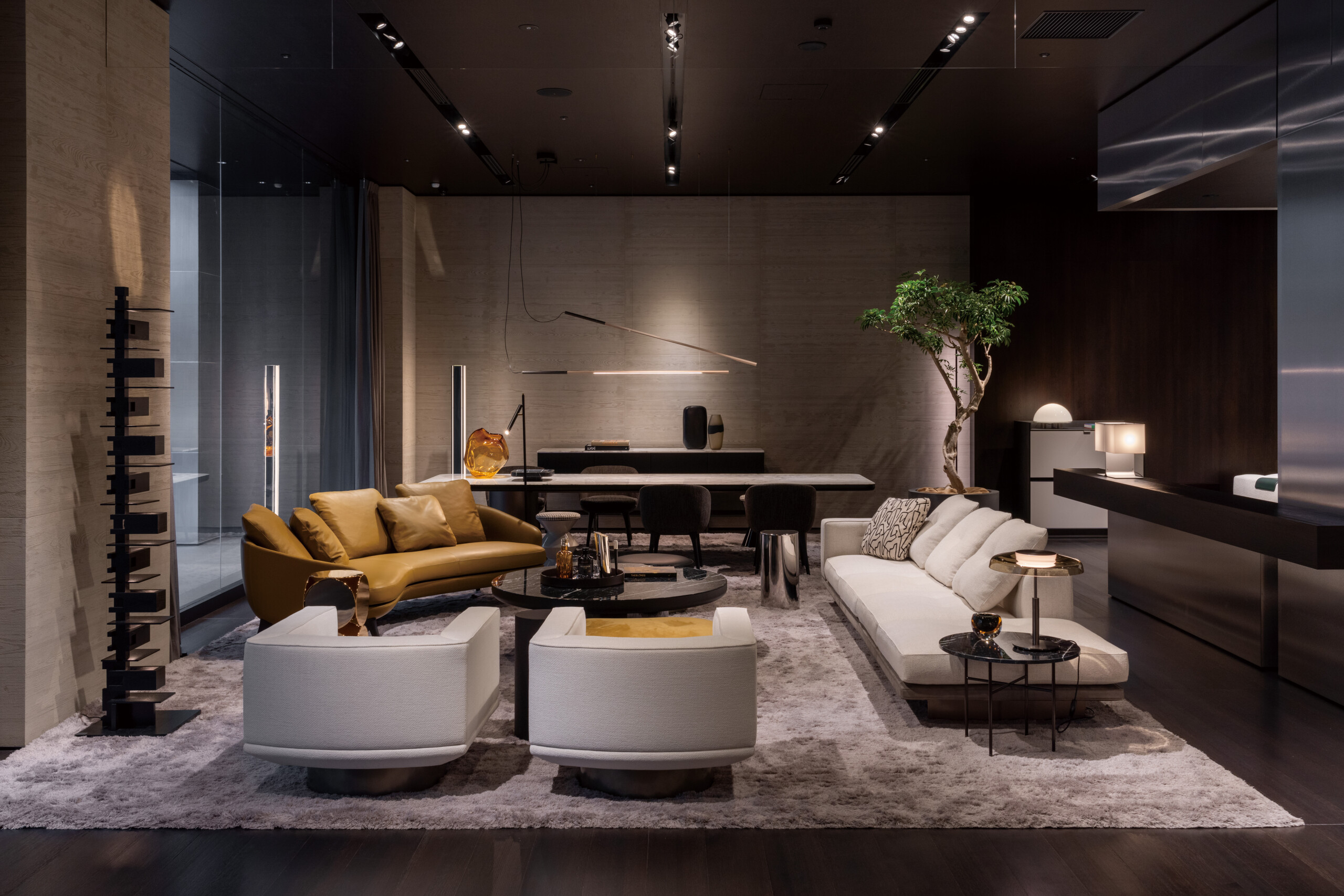 そんな特別な場所に満を持してオープンしたのが西日本エリアの旗艦の「Minotti KOBE」だ。東京・青山にある旗艦店「Minotti AOYAMA」と同等のスケールとなる2フロアにして延べ400㎡ほどのショールームがダイナミックに展開されている。この空間はイタリアのミノッティ スタジオが手掛けている。