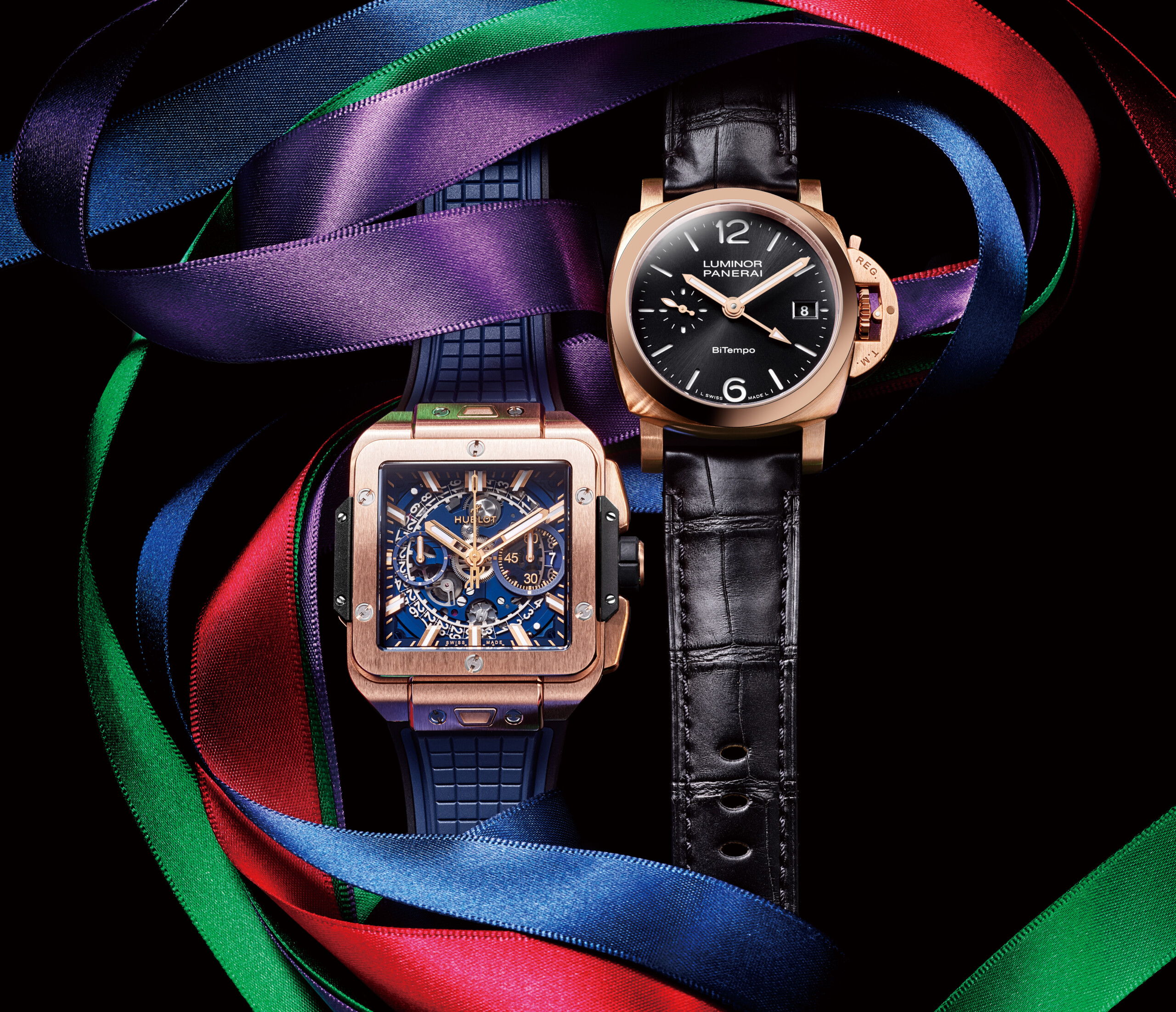 右/40mmのルミノールケースにGMT機能を搭載したシリーズに、ゴールドテックをケースとバックルに採用したバージョンが追加。このゴールドテックとは一般的なゴールドに銅とプラチナを加えた独自のゴールド合金で、赤い色調がプラスされ、金属の酸化を防いで変色への耐性を備えている。ビテンポとはイタリア語でデュアルタイムを意味し、1時間ごとジャンプして調整できるGMT針を装備する。自動巻き。サテンゴールドテックケース。ケース径40mm。383万9000円。㉄オフィチーネ パネライ☎0120-18-7110