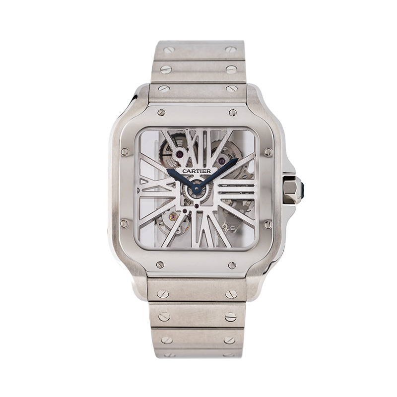 スクエアのフォルムとメカニカルなビス留めのデザインが象徴的な「サントス ドゥ カルティエ」は、世界初の実用的な腕時計として誕生。両面スケルトン仕様のこのモデルは、ローマ数字を象った自社製手巻き式ムーブメント「9611 MC」の動きを楽しめるのが魅力。手巻き。SSケース&ブレスレット。ケースサイズ47.5mm×39.8mm。506万8800円。㉄カルティエ カスタマー サービスセンター Tel.0120-1847-00