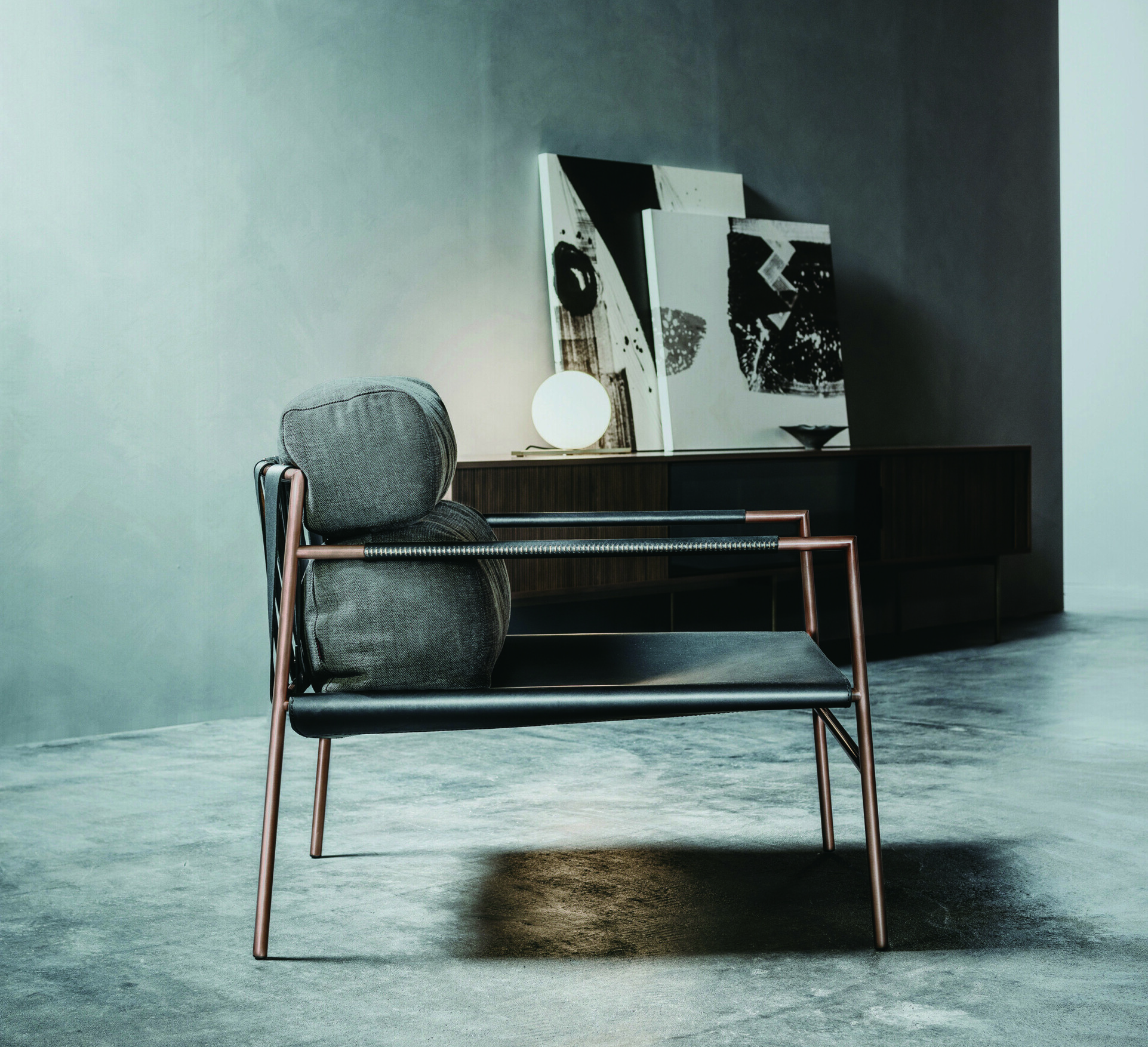2025年に発表された“VELAR (ヴェラール)モデュラーソファ”。「velar」はラテン語の「velare」に由来する言葉で「覆う、包む」という意味。高密度ウレタンフォームを使った座クッションと、ボルスター付きの背クッションが、座る人の身体を優しく包み込む。56アイテムから構成されるモジュール式で、リビング空間やライフスタイルに合わせて自由にカスタマイズできるのも魅力。極上の座り心地を追求したという“CONSTANTINO(コンスタンティーノ)イージーチェア”(写真左)との相性も抜群だ。