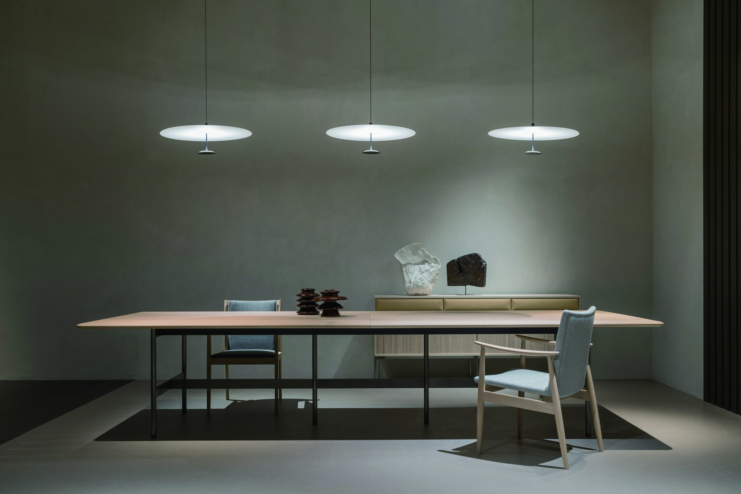 存在感のある天板と華奢な金属製の脚部のバランスが端正なダイニングテーブル“MTMテーブル”。厳選した無垢材をていねいに削り出した天板は優しく心地よい手触り。12人掛けの最大W4400タイプを含む4サイズを展開。天板や脚部の素材・カラーの選択肢も広く、好みに合わせてコーディネイトできる。