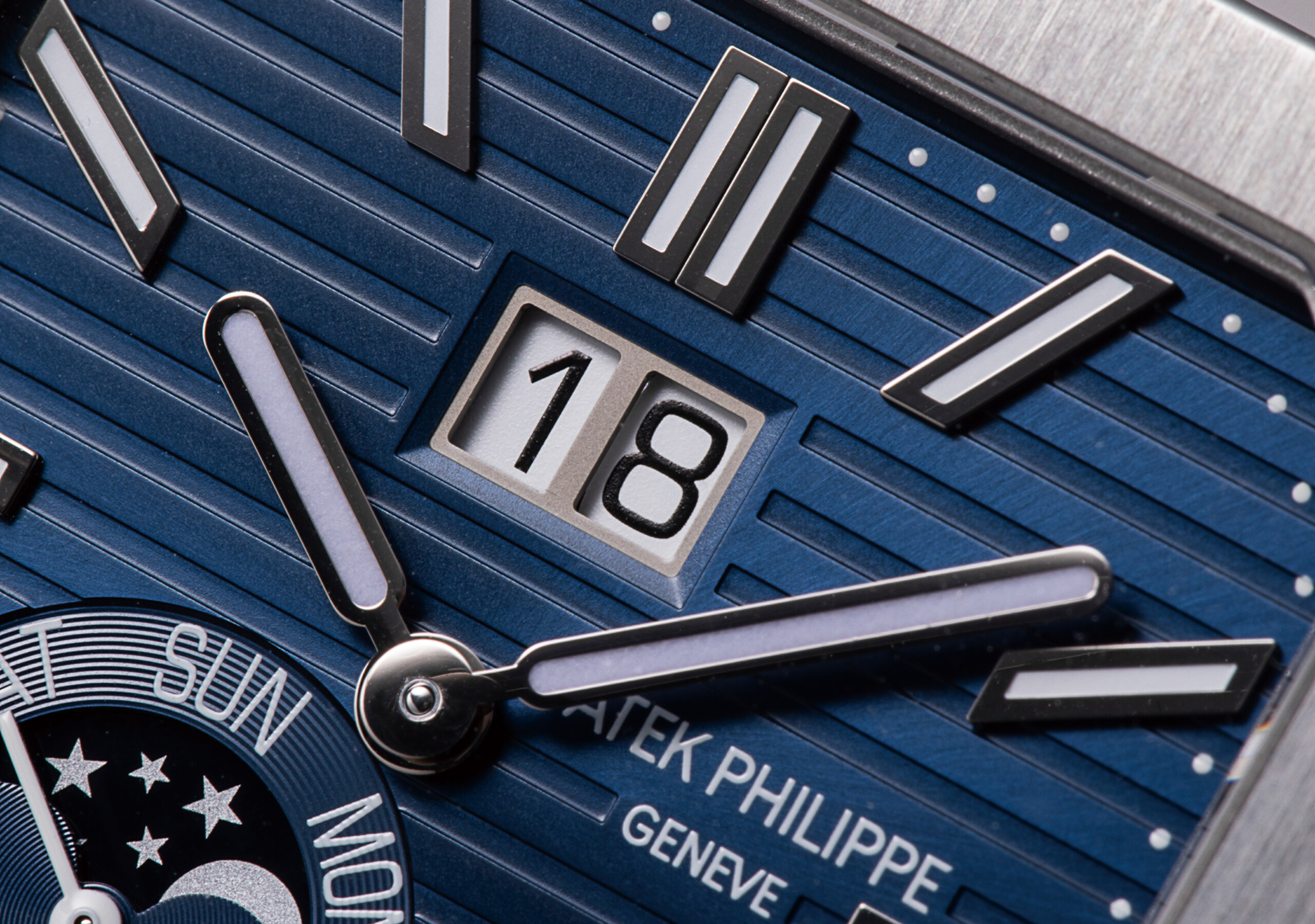 そのプロポーションは、横幅が44.9mm、上下が44.4mm、そして10時から4時位置の対角が45mmで、直線とエッジを強調させた八角形を形成する。小径モデルがトレンドの近年ではやや大きい印象だが、腕に載せると重心が低く薄型のケースがフィットし、装着感もいい。そして通称“耳”と呼ばれるリューズガードの意匠やフラットなベゼル、ダイヤルの水平エンボス・パターンなどの基本デザインは、「ノーチラス」を受け継いでいることがわかる。3針仕様のSSモデル、SS×18KRGコンビの2型、新型カレンダーを採用したプラチナモデルの1型がラインナップされ、新コレクションのデビューを飾った。